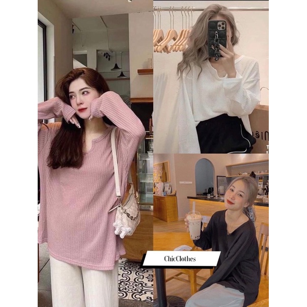 Freeship- Áo Len Xốp Dáng Rộng [FS] 🌸 Thun khoét cổ dài tay form thụng mặc thu đông 3 màu ĐEN TRẮNG HỒNG mua tại đây